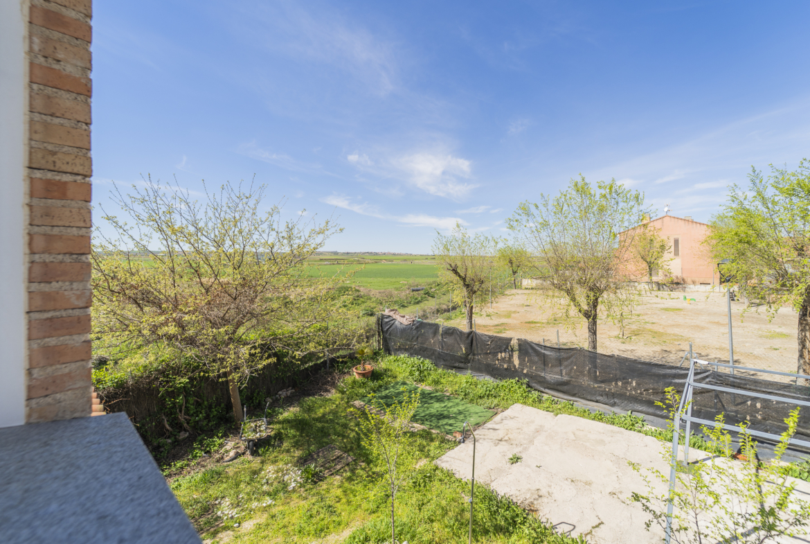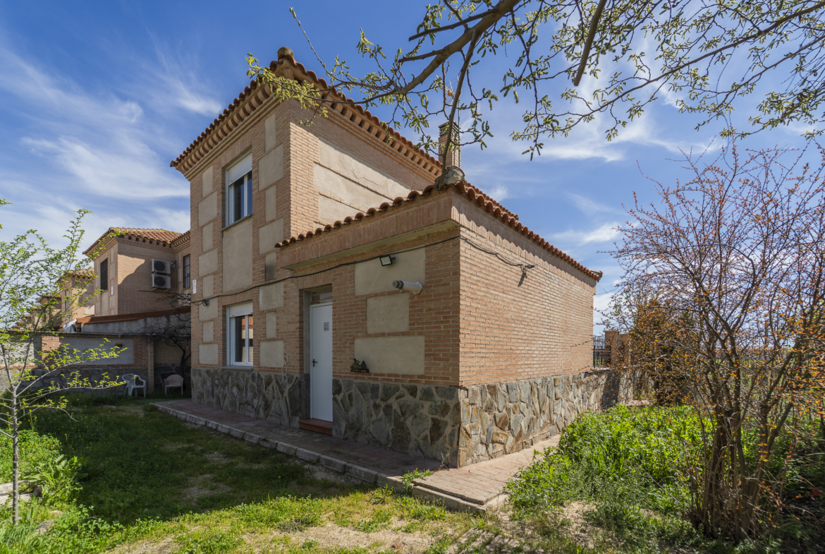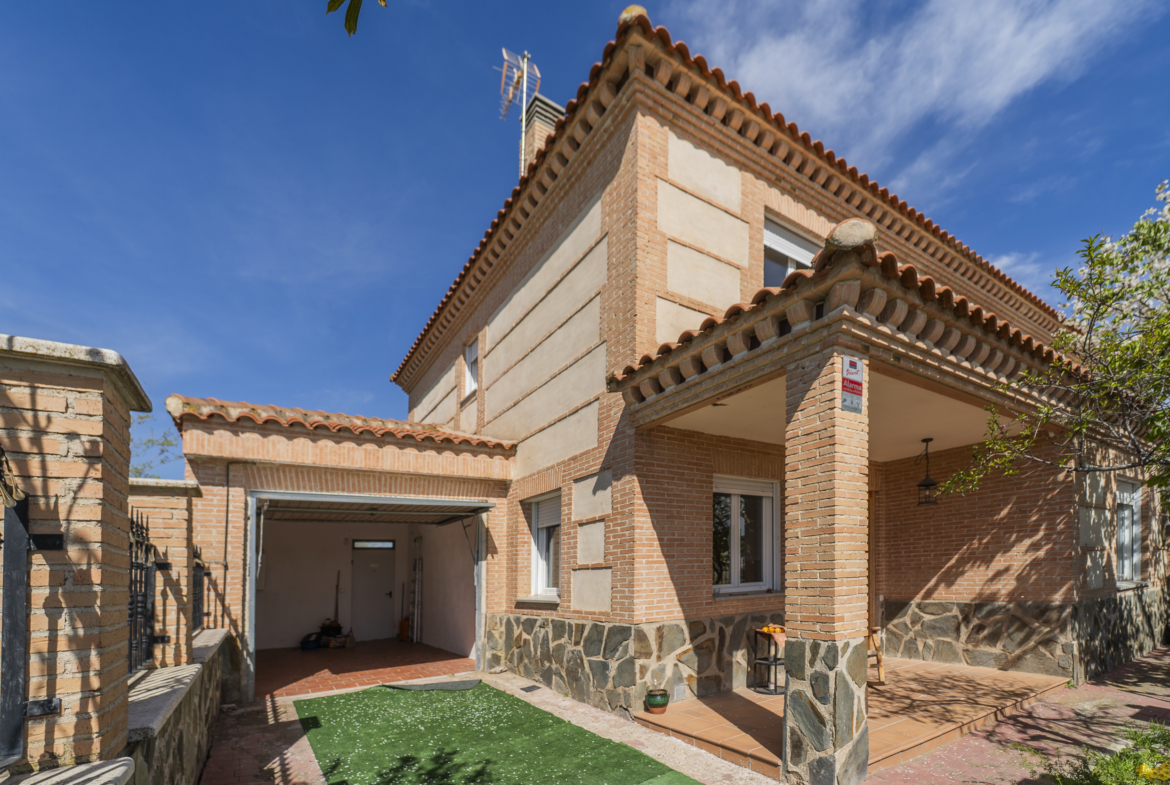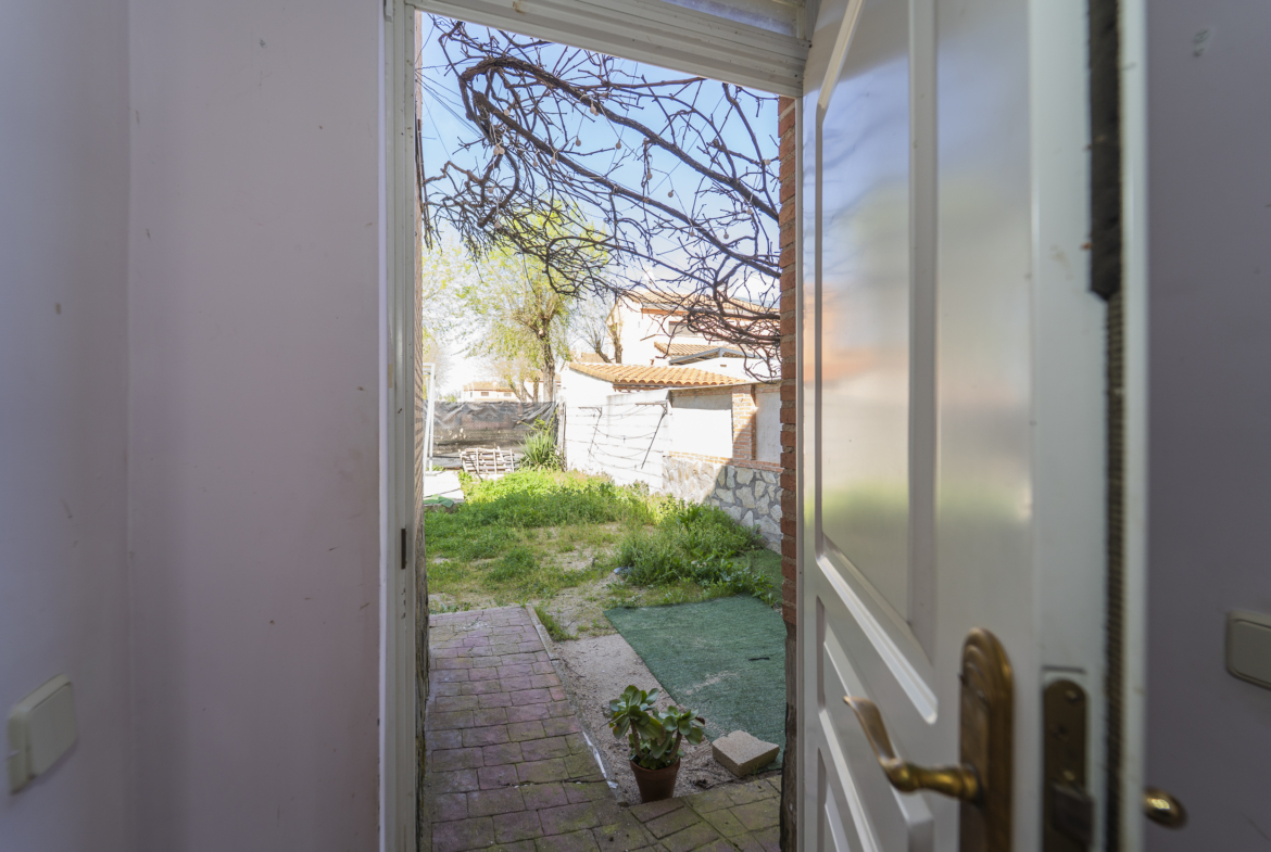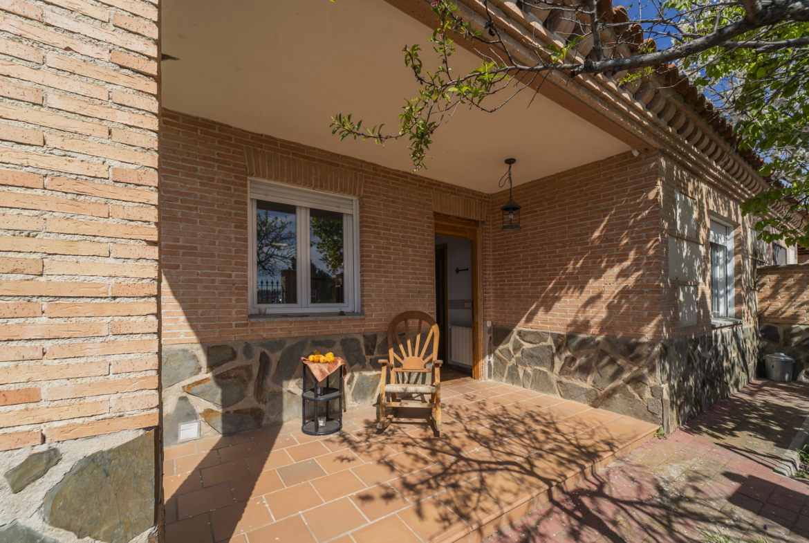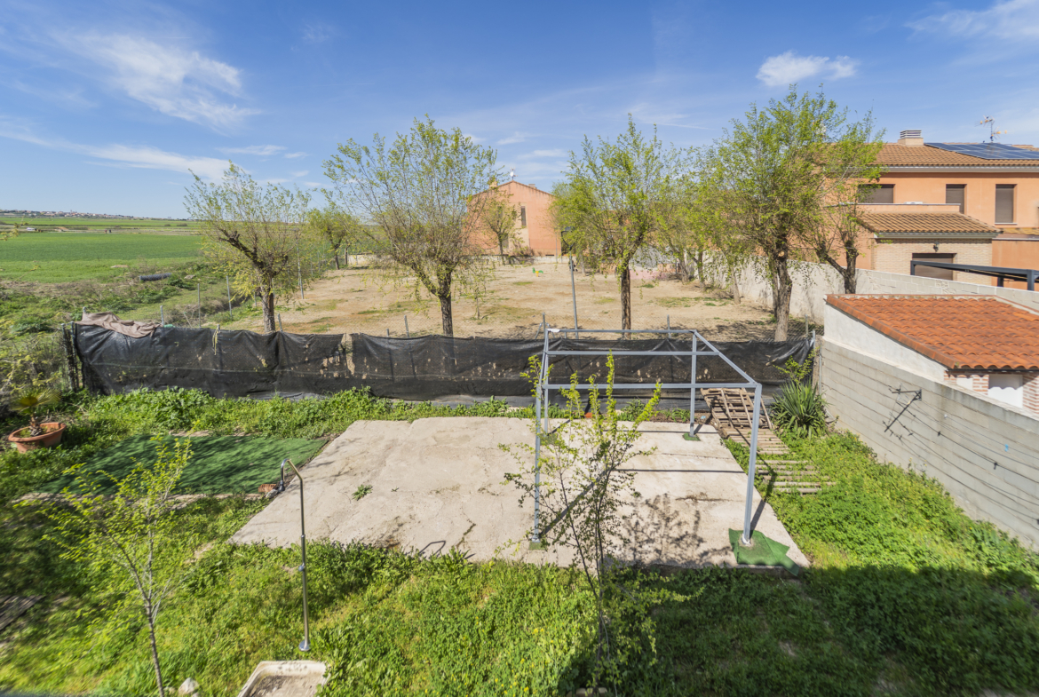 ​Exterior: La propiedad ofrece un jardín delantero y una amplia parcela trasera con arbolado frutal y espacio suficiente para construir una piscina y zona de disfrute al aire libre. Además, dispone de garaje en superficie.