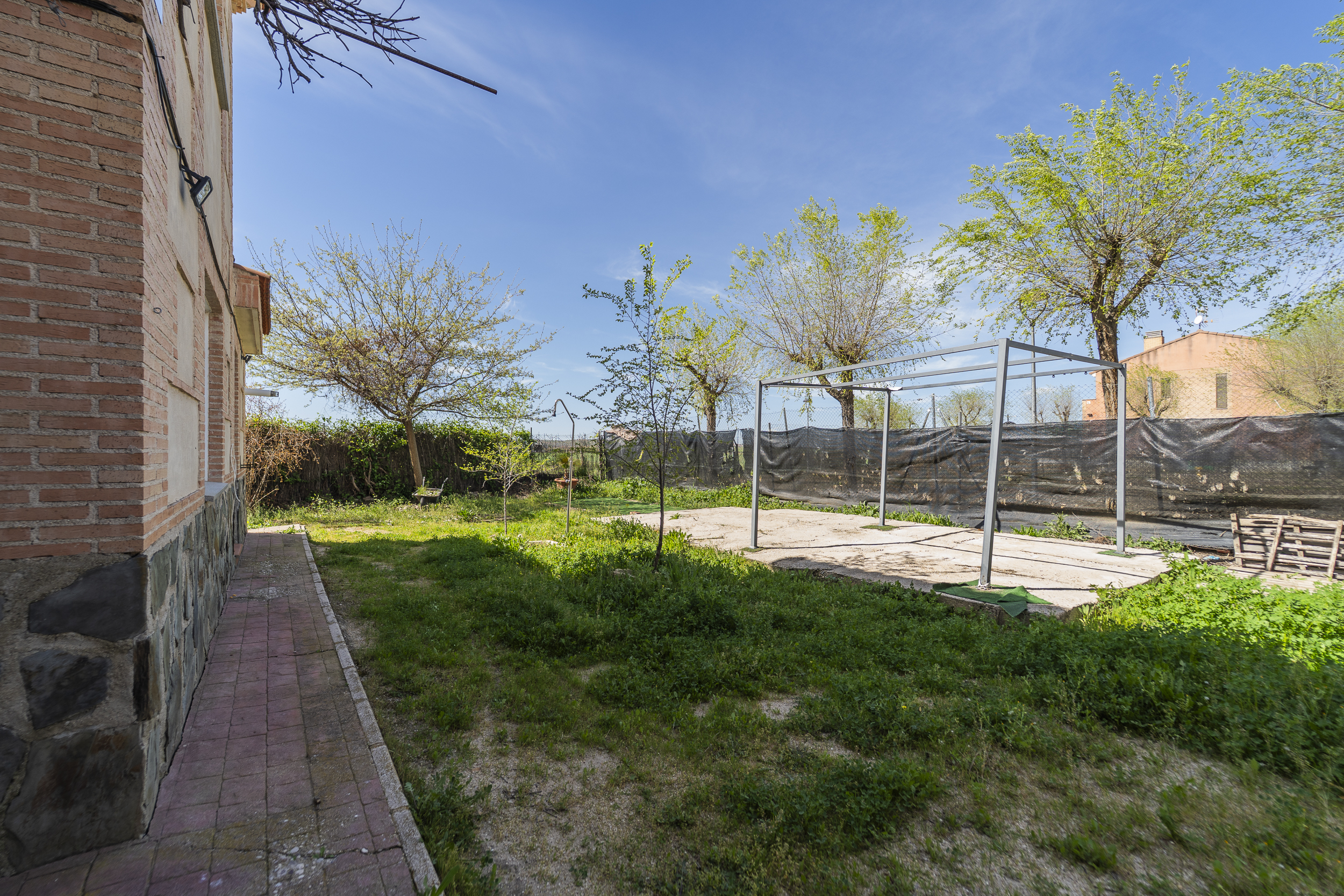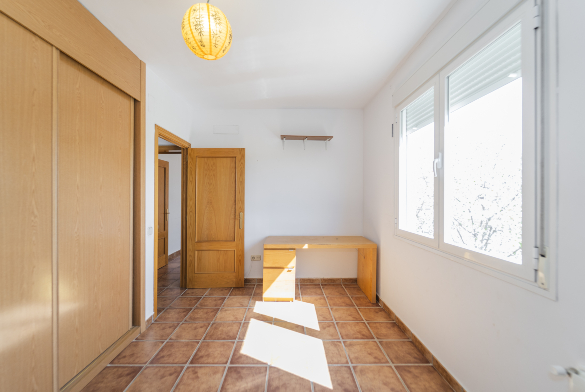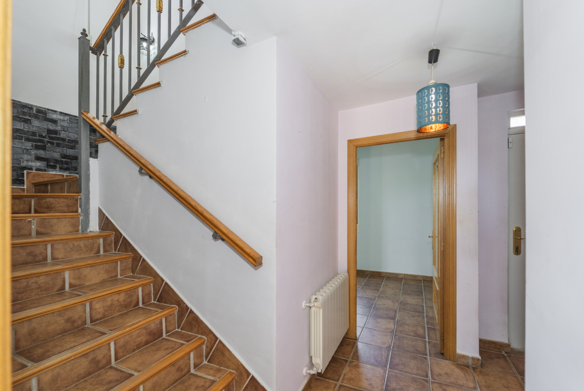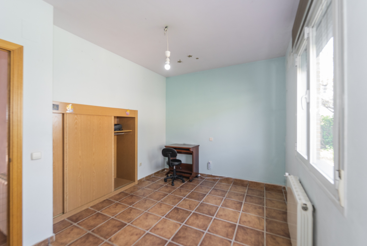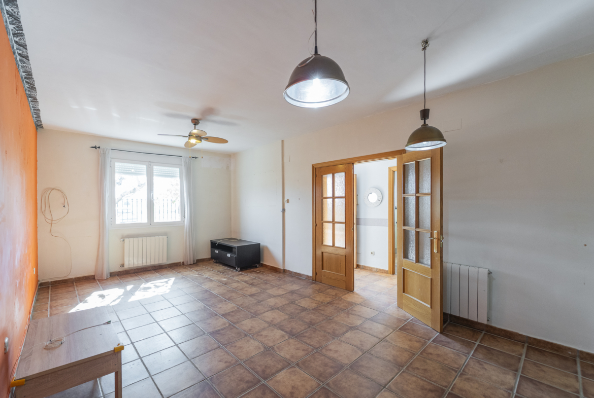 ​Exterior: La propiedad ofrece un jardín delantero y una amplia parcela trasera con arbolado frutal y espacio suficiente para construir una piscina y zona de disfrute al aire libre. Además, dispone de garaje en superficie.